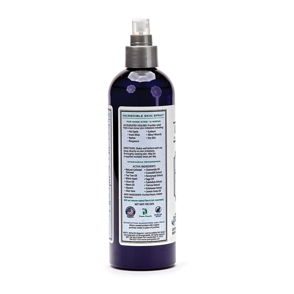 Richard’s Organics Incredible Skin Spray provides fast relief from hot spots, bites, sunburn, rashes, eczema, dry skin, ringworm and minor wounds. A unique formula uses a blend of 15 plant extracts that quickly provide anti-viral, anti-inflammatory and anti-bacterial action. Safe for pets and humans. 12 oz Made in USA.