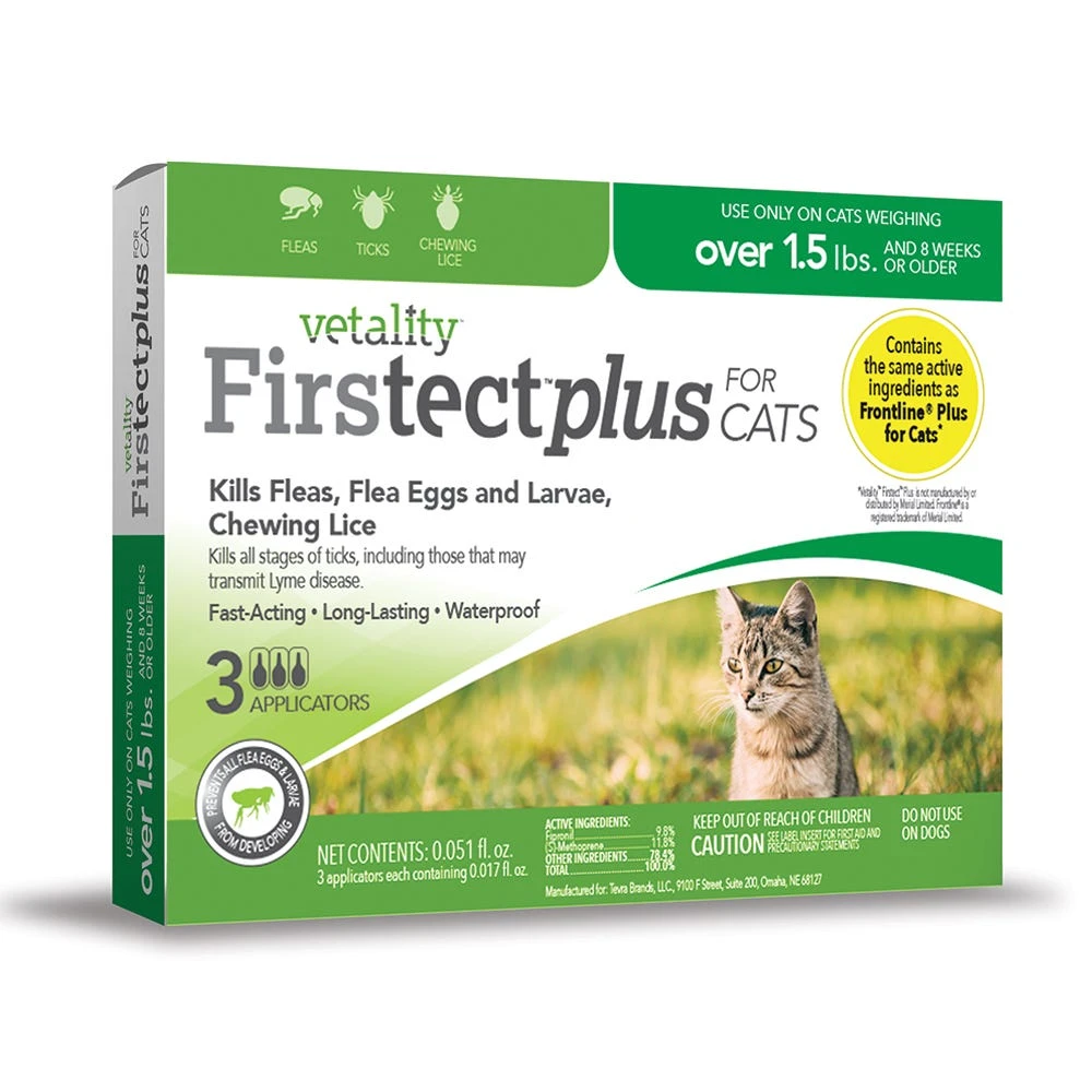 Vetality Firstect Plus for Cats offers vet quality protection from fleas and ticks and prevents all flea stages from developing. Kills Fleas, Flea Eggs and Larvae and Chewing Lice. Vetality Firstect Plus topicals eliminate fleas, flea eggs, ticks and lice. These vet-quality topicals contain the same active ingredients (fipronil + (S)-methoprene) as leading vet brand, FRONTLINE Plus®* for cats, but costs less.