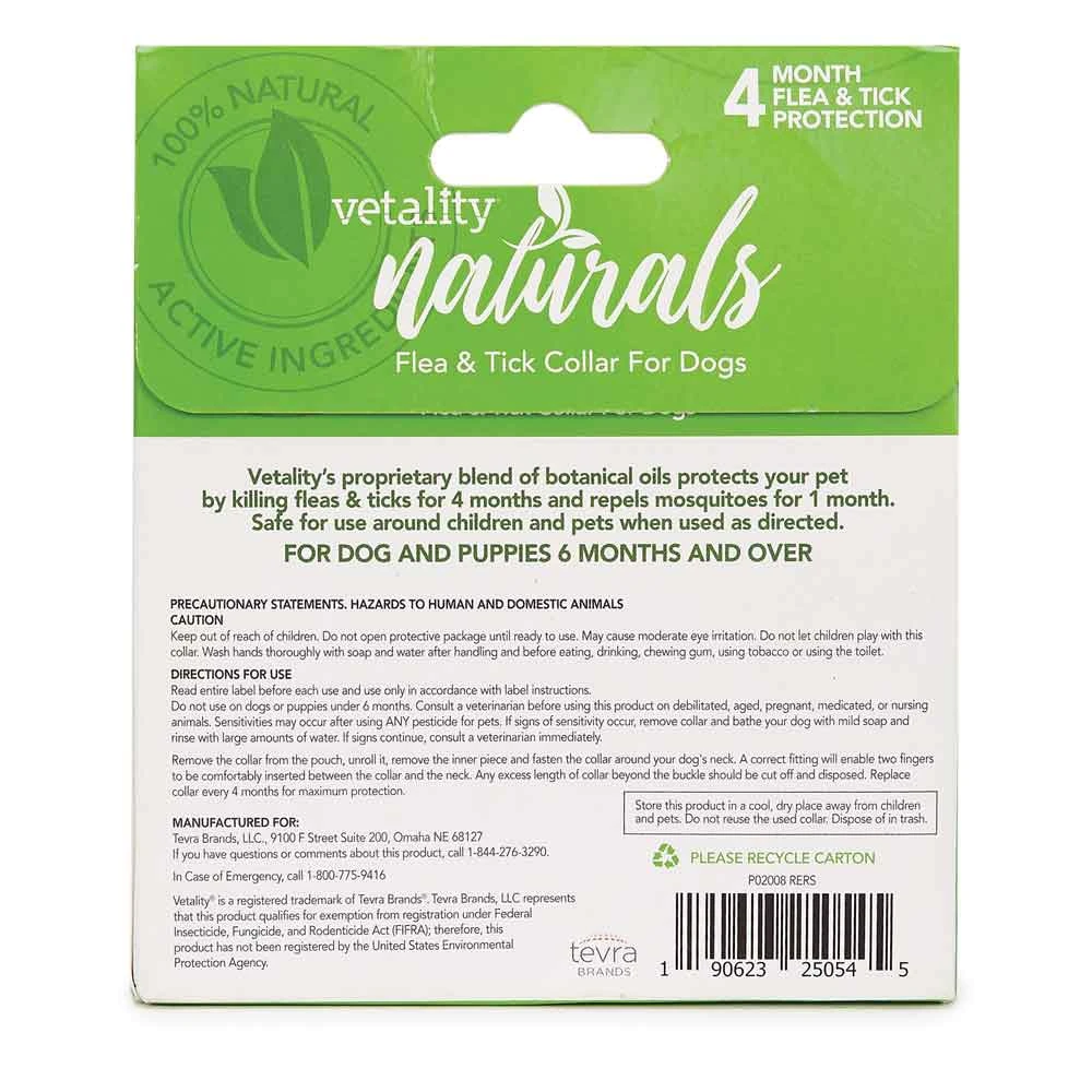 Vetality’s Naturals Flea & Tick Collar for Dogs proprietary blend of botanical oils protects dogs by killing fleas and ticks for 4 months and repels mosquitoes for 1 month. Safe for use around Children and pets when used as directed. For dog and puppies 6 months and over.