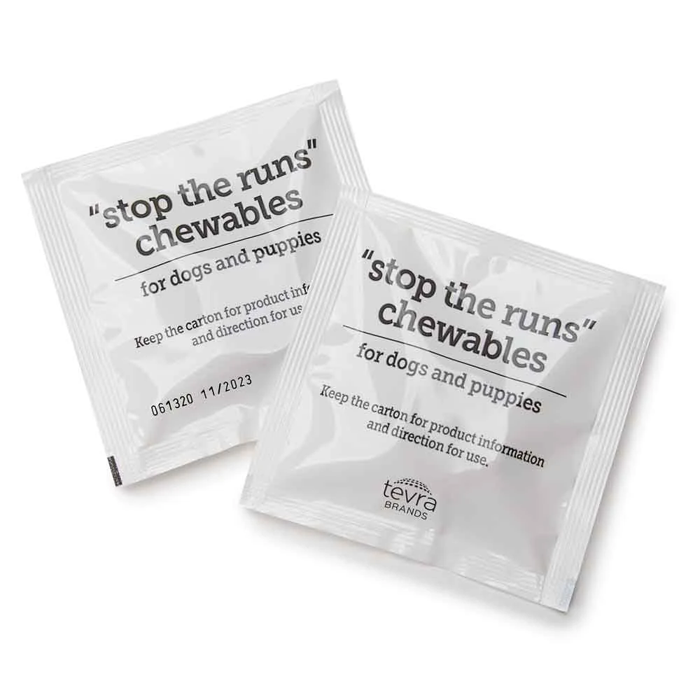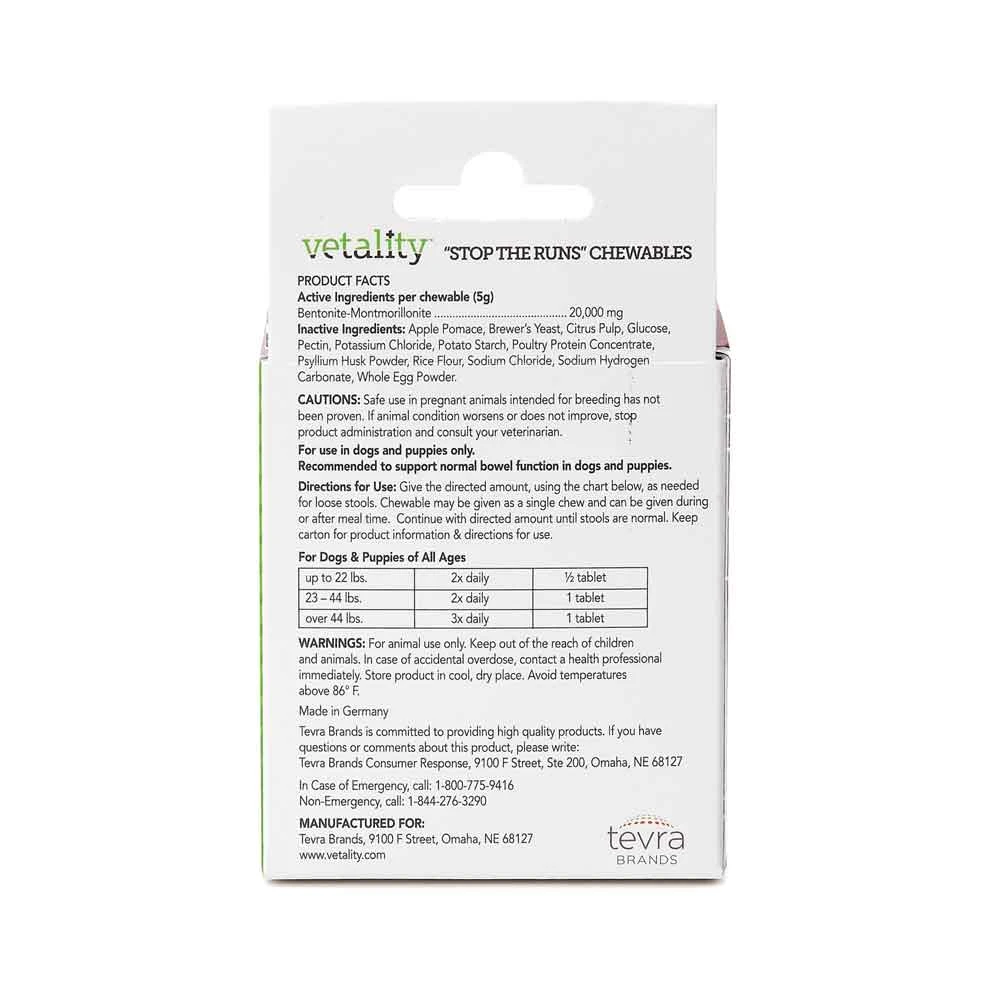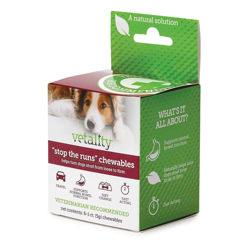 Vetality ‘Stop the Runs’ Chewables helps turn dog stools from loose to firm. Perfect for travel and home. Supports normal bowel function and aids in diet change. This fast-acting, all-natural, easy-to-use chewable, optimized for taste, contains a complex composition of natural extracts to help regulate gut activity. Tested and recommended by veterinarians, it is perfect for travel & diet changes. For dog & puppies of all ages & sizes. 6 count, safe for use in dogs & puppies of all ages & sizes.